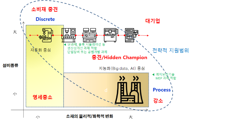 현장 제조기술의 문제는 B2C, B2B, Process, Discrete 산업에 따라서 그 접근이나 해결책이 달라집니다. 아래 그림을 활용하여 적합한 문제를 찾아 해결하는 것이 좋습니다. 다양한 외부자원을 활용하여 귀사의 문제를 해결하는 것이 가장 빠르고 가장 정확할 수 있습니다.
